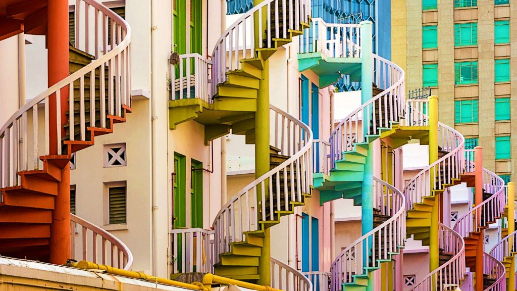 Những chiếc cầu thang xoắn ốc Bugis là những công trình kiến trúc độc đáo ở các cửa hàng của người Trung Quốc. Đứng một góc của cầu thang, bạn sẽ có phần nền lung linh cho tấm ảnh của mình.
