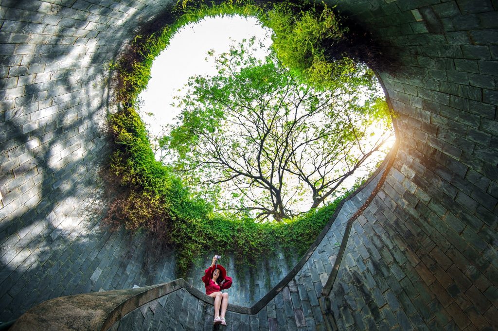 Đường hầm Fort Canning Tree hay giếng trời Singapore là một địa điểm nổi tiếng trên Instagram, khi nhiều người chụp ảnh từ dưới lên từ cầu thang xoắn ốc đến cái cây tuyệt đẹp lấp đầy bầu trời tròn ở trên. Mặc dù góc cầu thang nhuốm màu rêu phong, bờ tường gạch cũng cũ kỹ nhưng lên hình lại siêu ảo diệu.