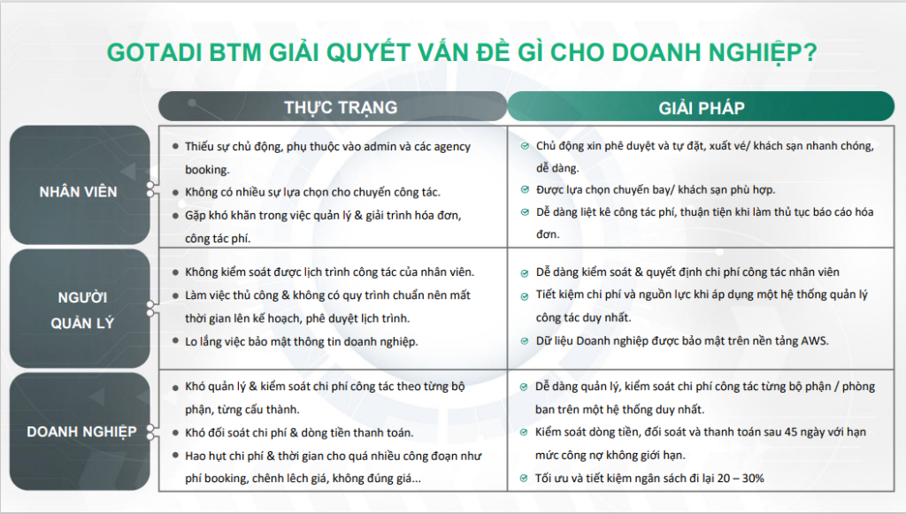 Việc đặt chỗ và quản lý các chuyến công tác tốn kém nhiều thời gian và nhân lực nhưng lại không tối ưu chi phí công tác.