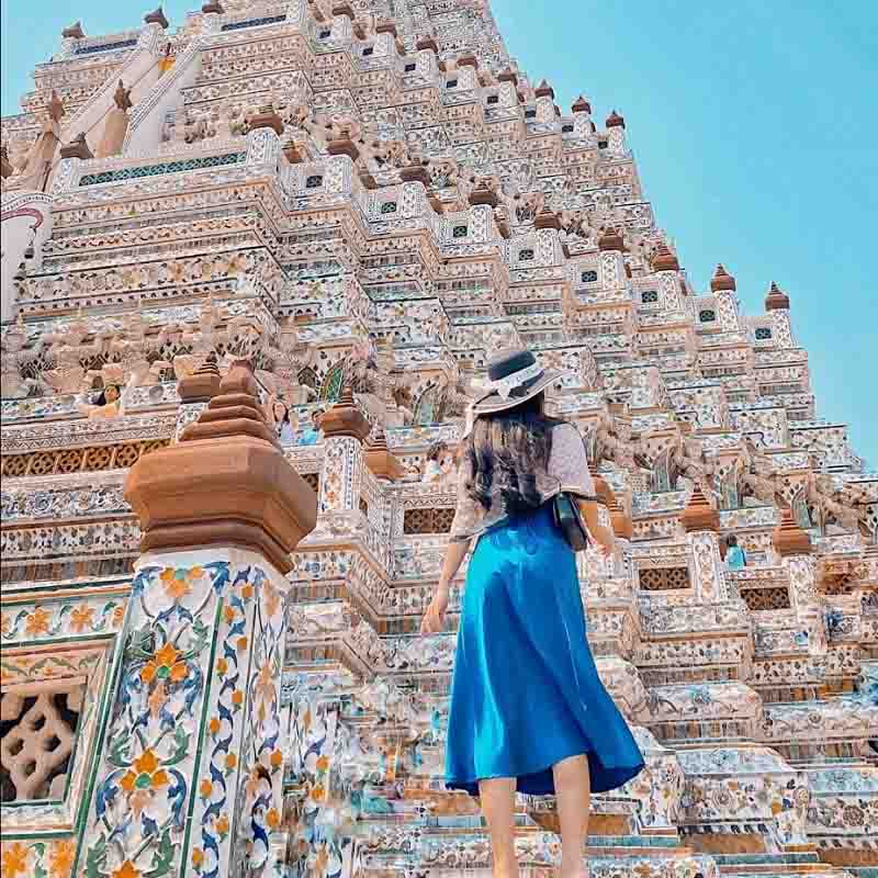 Chùa Wat Arun, hay Chùa Bình Minh, nổi bật với tháp trung tâm cao vút soi bóng bên dòng sông Chao Phraya.