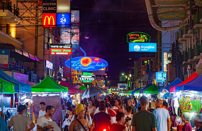 Khaosan Road là con phố sôi động bậc nhất Bangkok, nổi tiếng với ẩm thực đường phố Thái Lan.